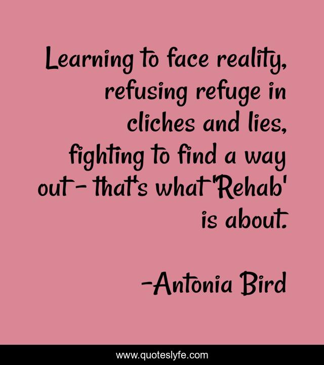 This page presents the quote "Learning to face reality, refusing refuge in cliches and lies, fighting to find a way out - that's what 'Rehab' is about.". Author of this quote is Antonia Bird. This quote is about reality, fighting, face,.