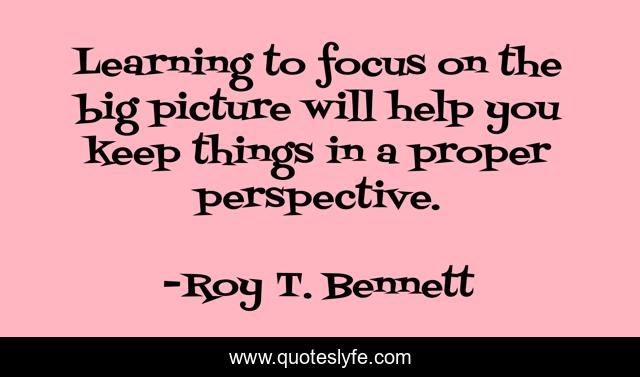 This page presents the quote "Learning to focus on the big picture will help you keep things in a proper perspective.". Author of this quote is Roy T. Bennett. This quote is about living, inspiring, inspire, inspiration, positive, positive-affirmation, motivational, life, confidence,.