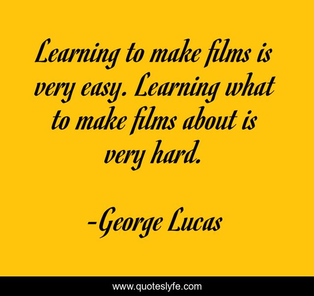 This page presents the quote "Learning to make films is very easy. Learning what to make films about is very hard.". Author of this quote is George Lucas. This quote is about movies, hard, easy,.