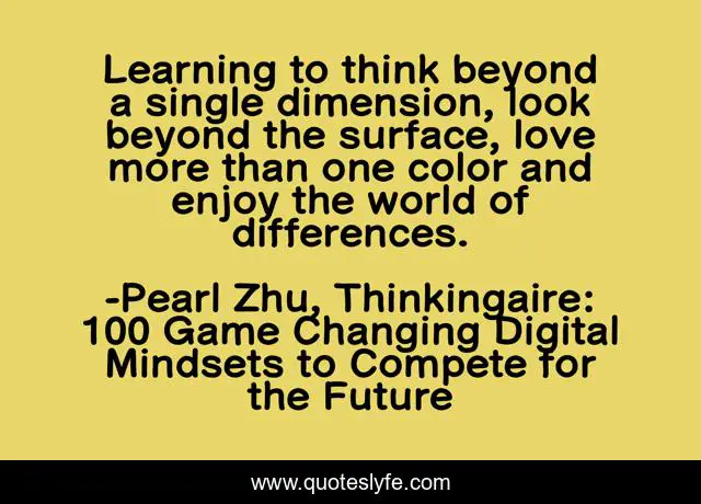 This page presents the quote "Learning to think beyond a single dimension, look beyond the surface, love more than one color and enjoy the world of differences.". Author of this quote is Pearl Zhu, Thinkingaire: 100 Game Changing Digital Mindsets to Compete for the Future. This quote is about thinking, mindset,.