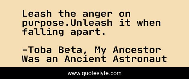 This page presents the quote "Leash the anger on purpose.Unleash it when falling apart.". Author of this quote is Toba Beta, My Ancestor Was an Ancient Astronaut. This quote is about anger, management,.