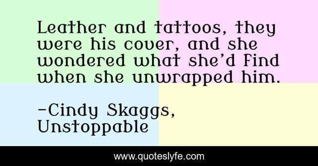 This page presents the quote "Leather and tattoos, they were his cover, and she wondered what she’d find when she unwrapped him.". Author of this quote is Cindy Skaggs, Unstoppable. This quote is about romance, action-adventure, tattooed-bad-boys, suspense-romance, romantic-suspense,.