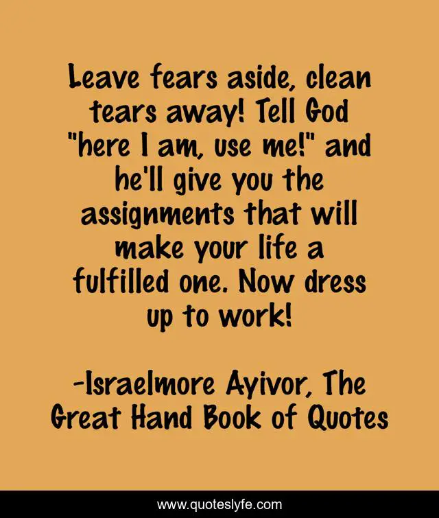 This page presents the quote "Leave fears aside, clean tears away! Tell God "here I am, use me!" and he'll give you the assignments that will make your life a fulfilled one. Now dress up to work!". Author of this quote is Israelmore Ayivor, The Great Hand Book of Quotes. This quote is about duty, wipe-the-tears, clean-the-tears, aside, fear, food-for-thought, god, away, dress-up,.
