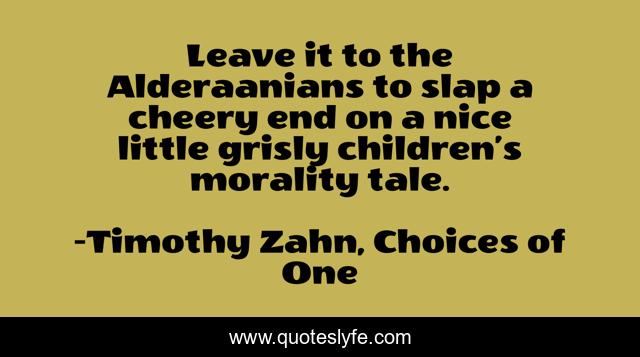 This page presents the quote "Leave it to the Alderaanians to slap a cheery end on a nice little grisly children’s morality tale.". Author of this quote is Timothy Zahn, Choices of One. This quote is about alderaan, han, morality,.