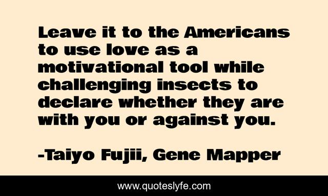 This page presents the quote "Leave it to the Americans to use love as a motivational tool while challenging insects to declare whether they are with you or against you.". Author of this quote is Taiyo Fujii, Gene Mapper. .