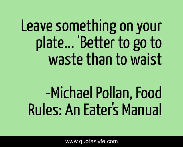 This page presents the quote "Leave something on your plate... 'Better to go to waste than to waist". Author of this quote is Michael Pollan, Food Rules: An Eater's Manual. This quote is about food, overeating,.