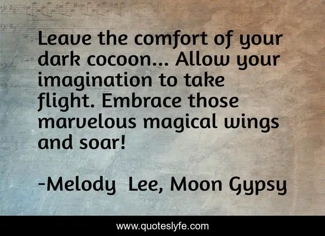 This page presents the quote "Leave the comfort of your dark cocoon... Allow your imagination to take flight. Embrace those marvelous magical wings and soar!". Author of this quote is Melody Lee, Moon Gypsy. This quote is about fly, magic, poetry, wings,.