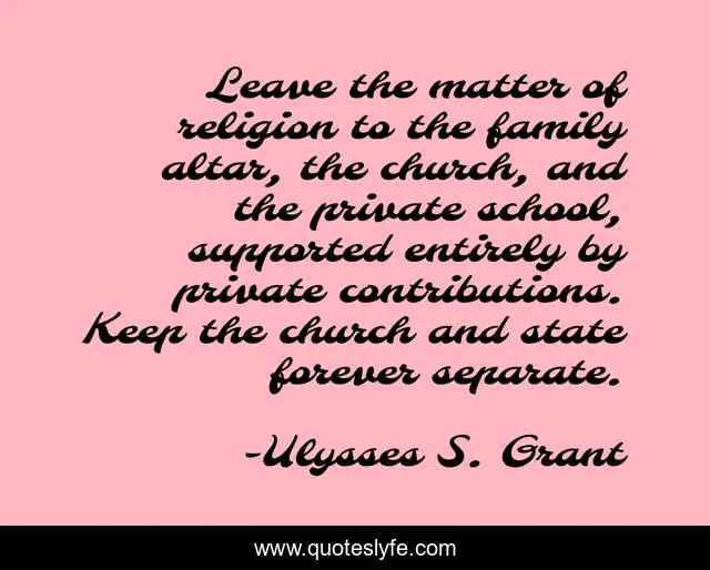 This page presents the quote "Leave the matter of religion to the family altar, the church, and the private school, supported entirely by private contributions. Keep the church and state forever separate.". Author of this quote is Ulysses S. Grant. This quote is about religion, school, church,.