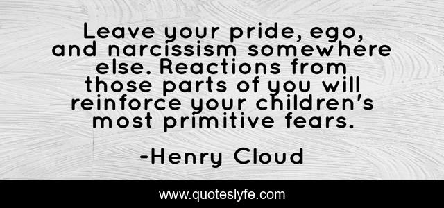 This page presents the quote "Leave your pride, ego, and narcissism somewhere else. Reactions from those parts of you will reinforce your children's most primitive fears.". Author of this quote is Henry Cloud. This quote is about boundaries, parenting, pride,.