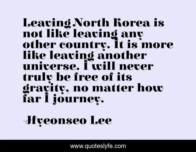 This page presents the quote "Leaving North Korea is not like leaving any other country. It is more like leaving another universe. I will never truly be free of its gravity, no matter how far I journey.". Author of this quote is Hyeonseo Lee. This quote is about north-korean-famine, defector, inspirational, enthusiasm, memoir, north-korea,.