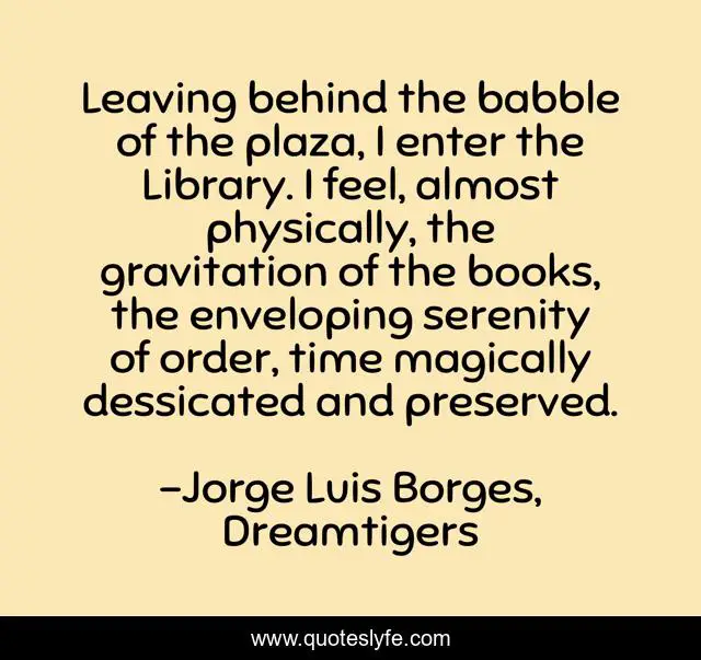 This page presents the quote "Leaving behind the babble of the plaza, I enter the Library. I feel, almost physically, the gravitation of the books, the enveloping serenity of order, time magically dessicated and preserved.". Author of this quote is Jorge Luis Borges, Dreamtigers. This quote is about books, peace, library,.