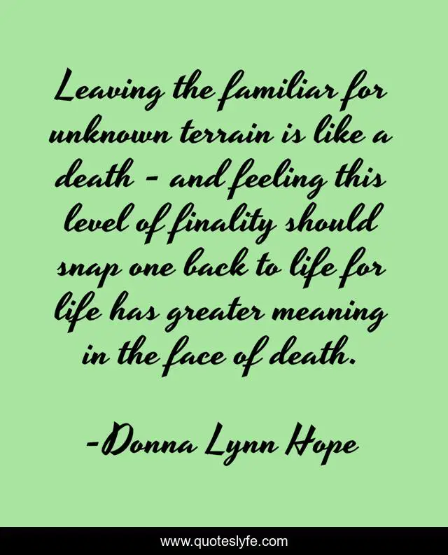 This page presents the quote "Leaving the familiar for unknown terrain is like a death - and feeling this level of finality should snap one back to life for life has greater meaning in the face of death.". Author of this quote is Donna Lynn Hope. This quote is about death, familiar, unfamiliar, meaning, finality, unknown, safety,.