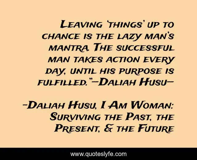 This page presents the quote "Leaving ‘things’ up to chance is the lazy man’s mantra. The successful man takes action every day, until his purpose is fulfilled.”—Daliah Husu—". Author of this quote is Daliah Husu, I Am Woman: Surviving the Past, the Present, & the Future. This quote is about dalia-husu, i-am-woman, inspirational, success, enthusiasm,.