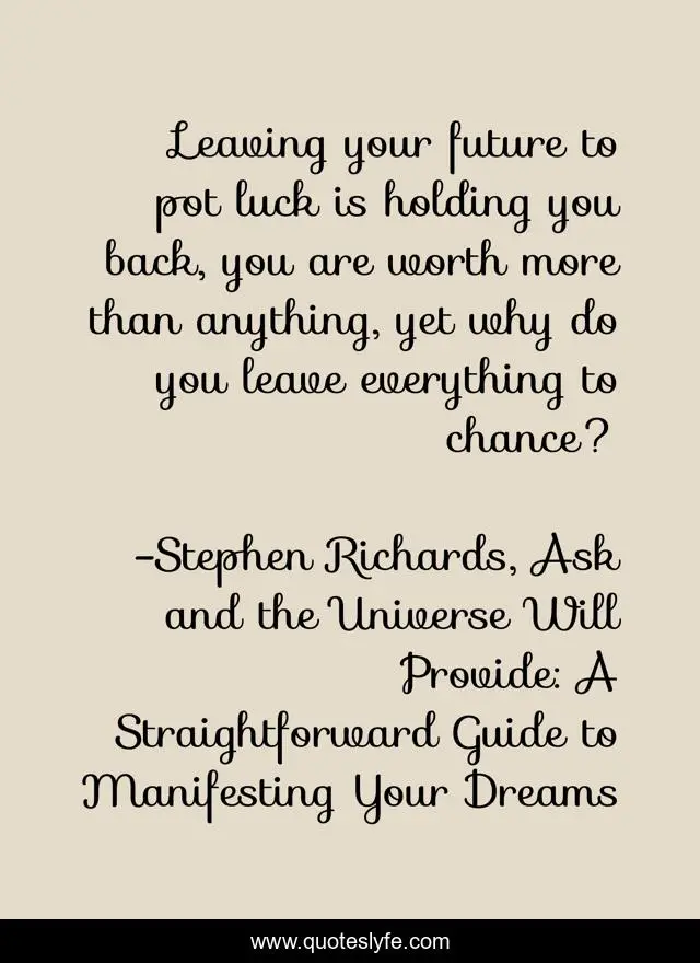 "Stephen Richards, Ask and the Universe Will Provide: A Straightforward Guide to Manifesting Your Dreams Quotes." Quoteslyfe.com, 2025. Mon. 08 Dec. 2025. <https://www.quoteslyfe.com/quote/Leaving-your-future-to-pot-luck-is-44805>.