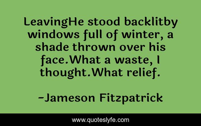 This page presents the quote "LeavingHe stood backlitby windows full of winter, a shade thrown over his face.What a waste, I thought.What relief.". Author of this quote is Jameson Fitzpatrick. This quote is about waste, relief, leaving,.