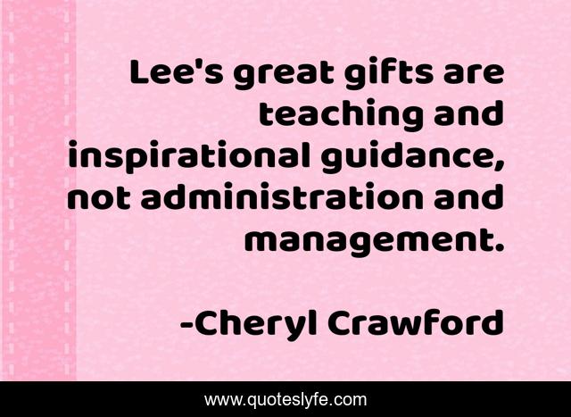This page presents the quote "Lee's great gifts are teaching and inspirational guidance, not administration and management.". Author of this quote is Cheryl Crawford. This quote is about great, management, guidance,.