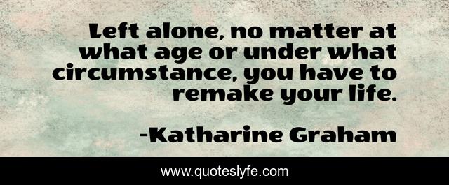 This page presents the quote "Left alone, no matter at what age or under what circumstance, you have to remake your life.". Author of this quote is Katharine Graham. This quote is about alone, life, starting-over,.