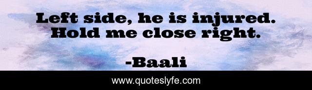 This page presents the quote "Left side, he is injured. Hold me close right.". Author of this quote is Baali. This quote is about helplessness, romantic, painful,.