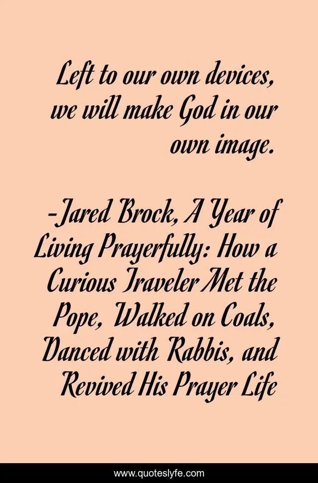 "Jared Brock, A Year of Living Prayerfully: How a Curious Traveler Met the Pope, Walked on Coals, Danced with Rabbis, and Revived His Prayer Life Quotes." Quoteslyfe.com, 2025. Sat. 06 Dec. 2025. <https://www.quoteslyfe.com/quote/Left-to-our-own-devices-we-will-240414>.
