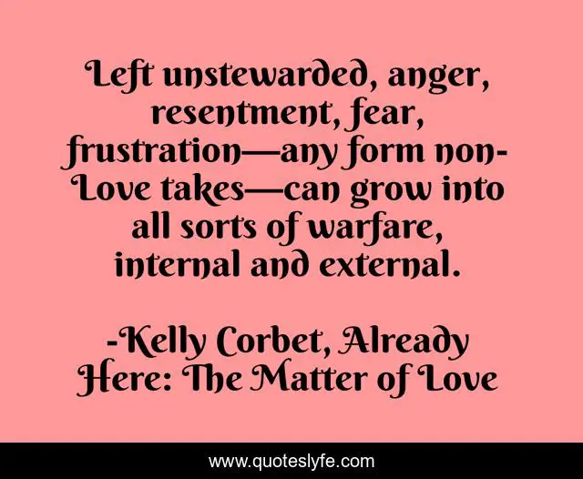 This page presents the quote "Left unstewarded, anger, resentment, fear, frustration—any form non-Love takes—can grow into all sorts of warfare, internal and external.". Author of this quote is Kelly Corbet, Already Here: The Matter of Love. .