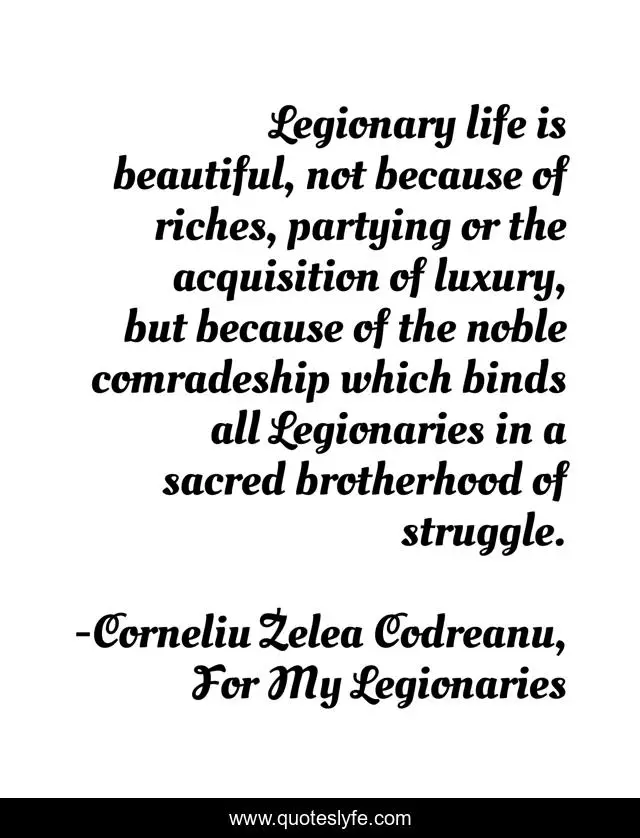 This page presents the quote "Legionary life is beautiful, not because of riches, partying or the acquisition of luxury, but because of the noble comradeship which binds all Legionaries in a sacred brotherhood of struggle.". Author of this quote is Corneliu Zelea Codreanu, For My Legionaries. This quote is about comradeship, struggle, beauty,.