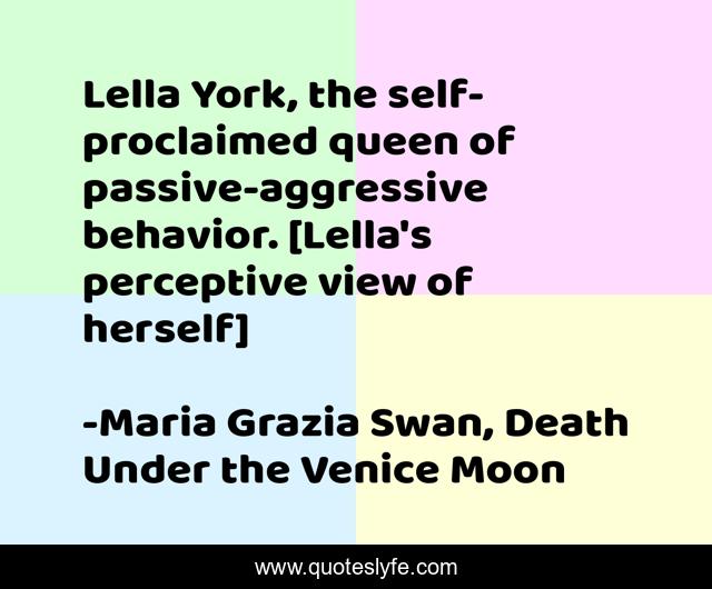 This page presents the quote "Lella York, the self-proclaimed queen of passive-aggressive behavior. [Lella's perceptive view of herself]". Author of this quote is Maria Grazia Swan, Death Under the Venice Moon. This quote is about mystery, venice, italy, cozy,.