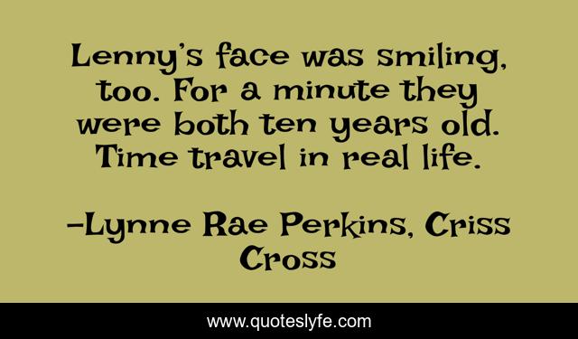 This page presents the quote "Lenny’s face was smiling, too. For a minute they were both ten years old. Time travel in real life.". Author of this quote is Lynne Rae Perkins, Criss Cross. This quote is about smiling, childhood,.