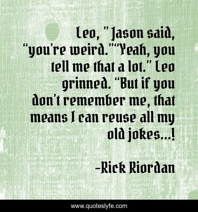 This page presents the quote "Leo, ” Jason said, “you’re weird.”“Yeah, you tell me that a lot.” Leo grinned. “But if you don’t remember me, that means I can reuse all my old jokes...!". Author of this quote is Rick Riordan. This quote is about fantasy, humor, young-adult,.