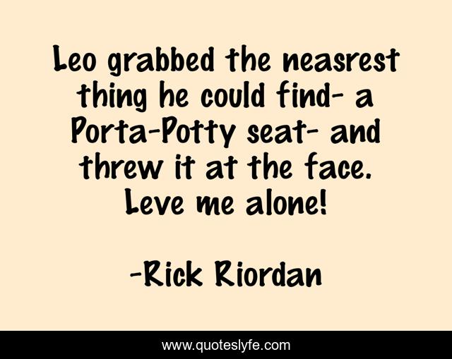 This page presents the quote "Leo grabbed the neasrest thing he could find- a Porta-Potty seat- and threw it at the face. Leve me alone!". Author of this quote is Rick Riordan. This quote is about hero, humor, leo,.