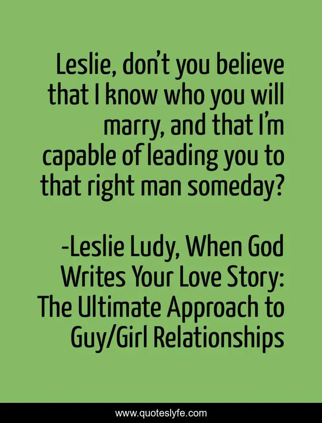 This page presents the quote "Leslie, don’t you believe that I know who you will marry, and that I’m capable of leading you to that right man someday?". Author of this quote is Leslie Ludy, When God Writes Your Love Story: The Ultimate Approach to Guy/Girl Relationships. This quote is about courtship, dating, marriage, christian-dating, trusting-god,.