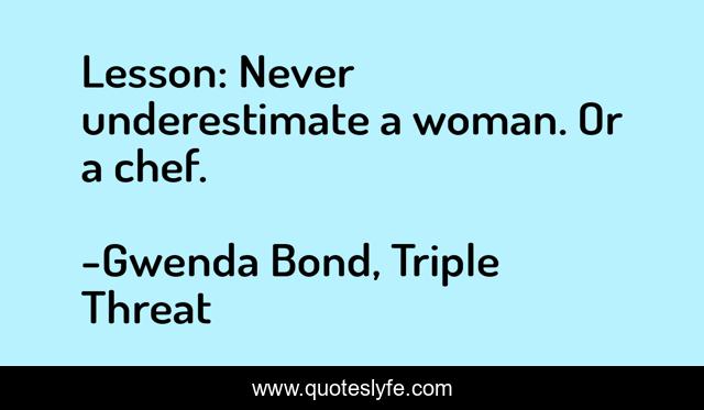 This page presents the quote "Lesson: Never underestimate a woman. Or a chef.". Author of this quote is Gwenda Bond, Triple Threat. This quote is about spy, lois-lane, gwenda-bond, journalism, julia-child, triple-threat, female-empowerment, underestimate,.
