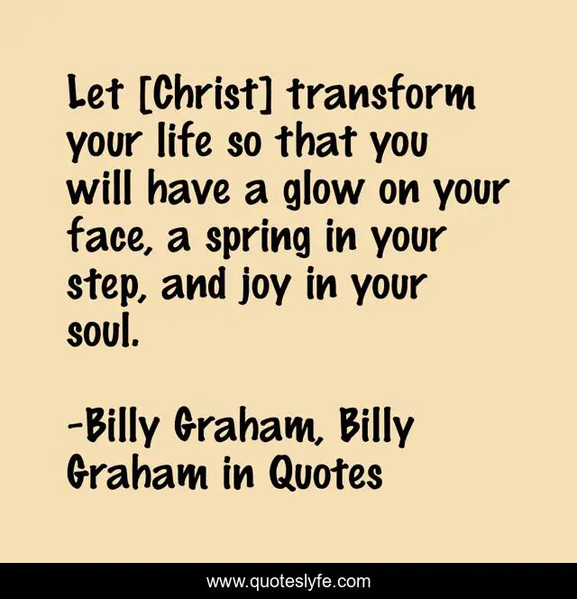 This page presents the quote "Let [Christ] transform your life so that you will have a glow on your face, a spring in your step, and joy in your soul.". Author of this quote is Billy Graham, Billy Graham in Quotes. This quote is about billy-graham, the-soul,.