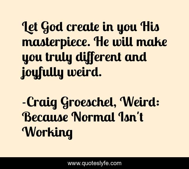 This page presents the quote "Let God create in you His masterpiece. He will make you truly different and joyfully weird.". Author of this quote is Craig Groeschel, Weird: Because Normal Isn't Working. This quote is about and, different, his, joyfully, god, create, truly, masterpiece, let,.