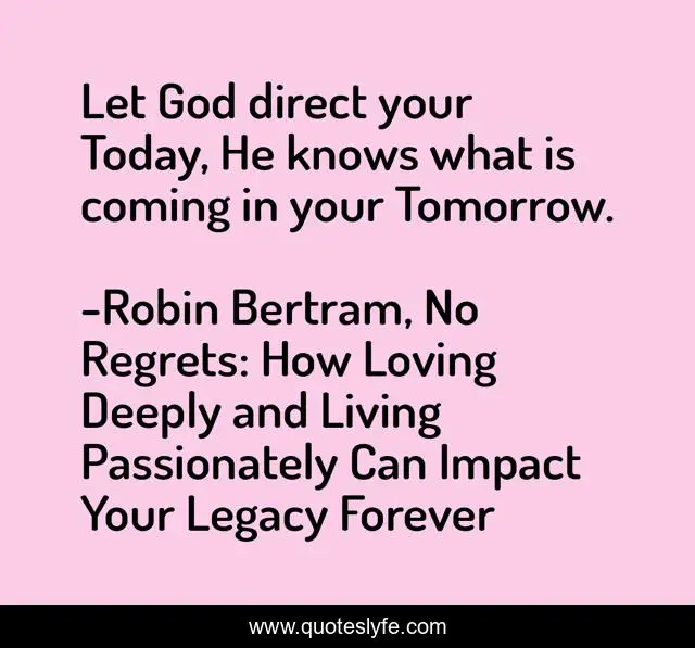 "Robin Bertram, No Regrets: How Loving Deeply and Living Passionately Can Impact Your Legacy Forever Quotes." Quoteslyfe.com, 2025. Fri. 05 Dec. 2025. <https://www.quoteslyfe.com/quote/Let-God-direct-your-Today-He-knows-109994>.