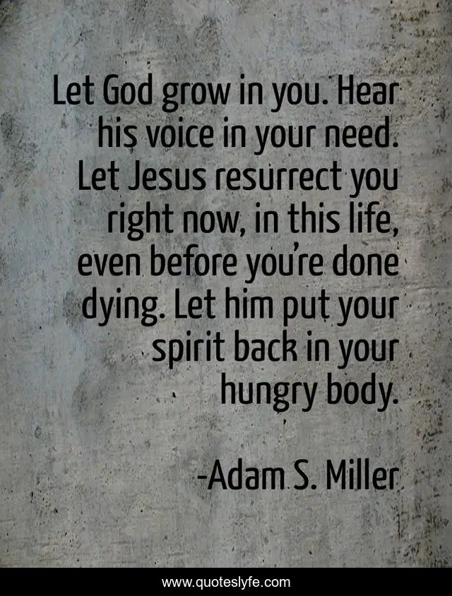 This page presents the quote "Let God grow in you. Hear his voice in your need. Let Jesus resurrect you right now, in this life, even before you’re done dying. Let him put your spirit back in your hungry body.". Author of this quote is Adam S. Miller. This quote is about mormonism, jesus,.