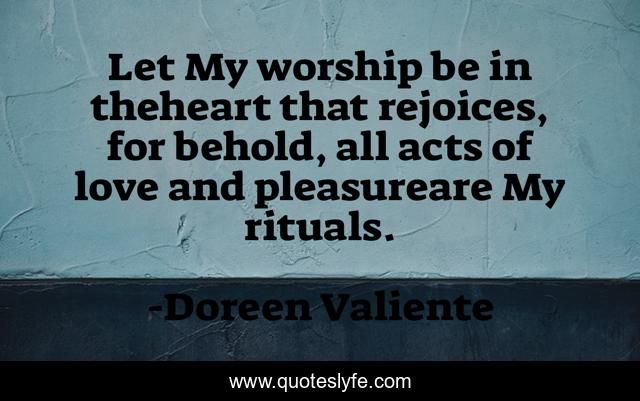 This page presents the quote "Let My worship be in theheart that rejoices, for behold, all acts of love and pleasureare My rituals.". Author of this quote is Doreen Valiente. This quote is about pleasure, goddess, love, worship, affection,.