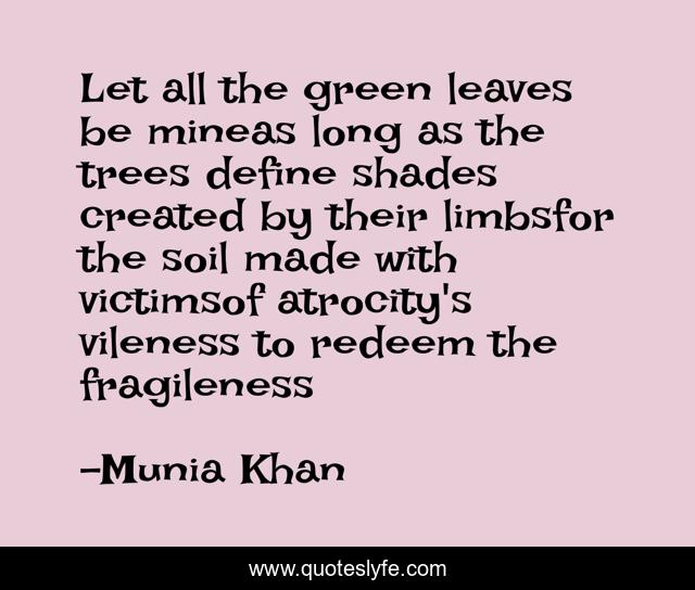 This page presents the quote "Let all the green leaves be mineas long as the trees define shades created by their limbsfor the soil made with victimsof atrocity's vileness to redeem the fragileness". Author of this quote is Munia Khan. This quote is about rhyming, vile, soil, victim, vileness, limbs, fragile-things, rhyming-verse, define,.