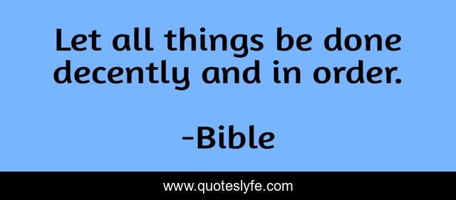 This page presents the quote "Let all things be done decently and in order.". Author of this quote is Bible. This quote is about organization, order,.