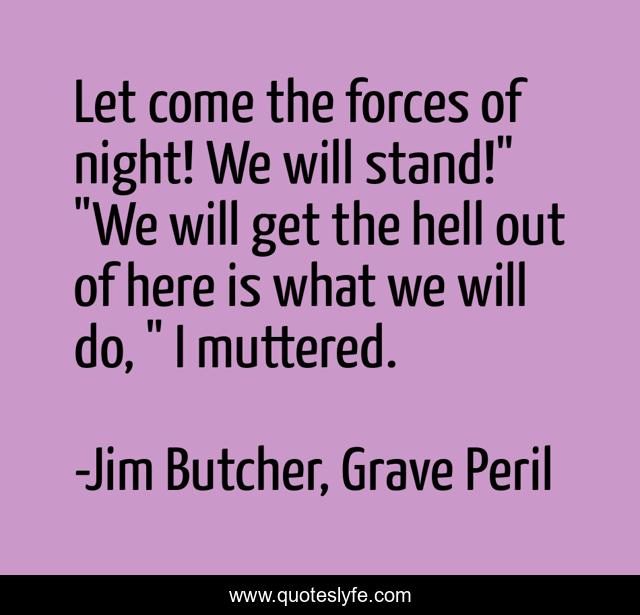 This page presents the quote "Let come the forces of night! We will stand!" "We will get the hell out of here is what we will do, " I muttered.". Author of this quote is Jim Butcher, Grave Peril. This quote is about funny, courage, humor, comedy, fight,.