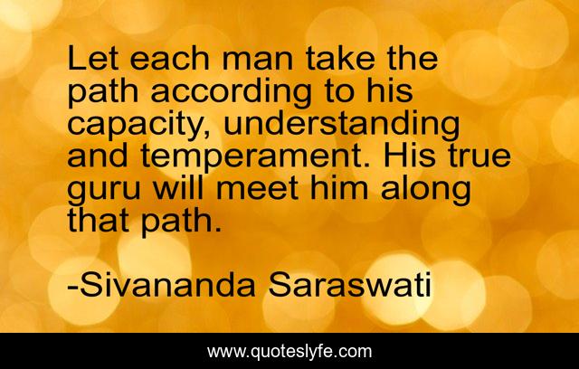 This page presents the quote "Let each man take the path according to his capacity, understanding and temperament. His true guru will meet him along that path.". Author of this quote is Sivananda Saraswati. This quote is about path, guru, spirit, inspirational, enthusiasm,.