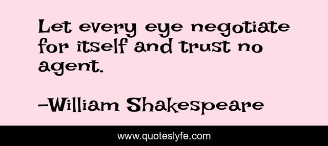 This page presents the quote "Let every eye negotiate for itself and trust no agent.". Author of this quote is William Shakespeare. This quote is about eye, negotiate,.