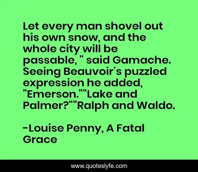 Let every man shovel out his own snow, and the whole city will be passable, " said Gamache. Seeing Beauvoir's puzzled expression he added, "Emerson.""Lake and Palmer?""Ralph and Waldo.