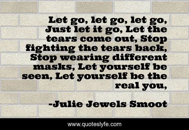 This page presents the quote "Let go, let go, let go, Just let it go, Let the tears come out, Stop fighting the tears back, Stop wearing different masks, Let yourself be seen, Let yourself be the real you, ". Author of this quote is Julie Jewels Smoot. This quote is about enthusiasm, healing, inspirational, poetry,.