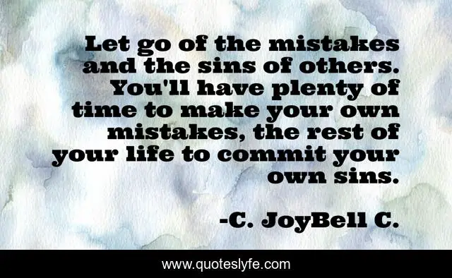 This page presents the quote "Let go of the mistakes and the sins of others. You'll have plenty of time to make your own mistakes, the rest of your life to commit your own sins.". Author of this quote is C. JoyBell C.. This quote is about mistakes, dont-be-judgmental, advice, life-and-living, sins,.