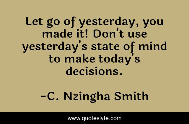 This page presents the quote "Let go of yesterday, you made it! Don't use yesterday's state of mind to make today's decisions.". Author of this quote is C. Nzingha Smith. This quote is about courage-in-life, inspirational, inspirational-life, enthusiasm, decisions-inspirational, memories-truth,.