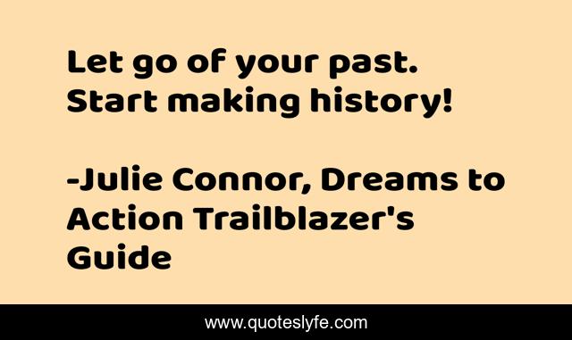 This page presents the quote "Let go of your past. Start making history!". Author of this quote is Julie Connor, Dreams to Action Trailblazer's Guide. This quote is about future-plans, future-goals, follow-your-dreams, goals, action, resolution, dreams,.