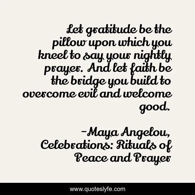 This page presents the quote "Let gratitude be the pillow upon which you kneel to say your nightly prayer. And let faith be the bridge you build to overcome evil and welcome good.". Author of this quote is Maya Angelou, Celebrations: Rituals of Peace and Prayer. This quote is about gratitude, birthday, maya-angelou, oprah,.
