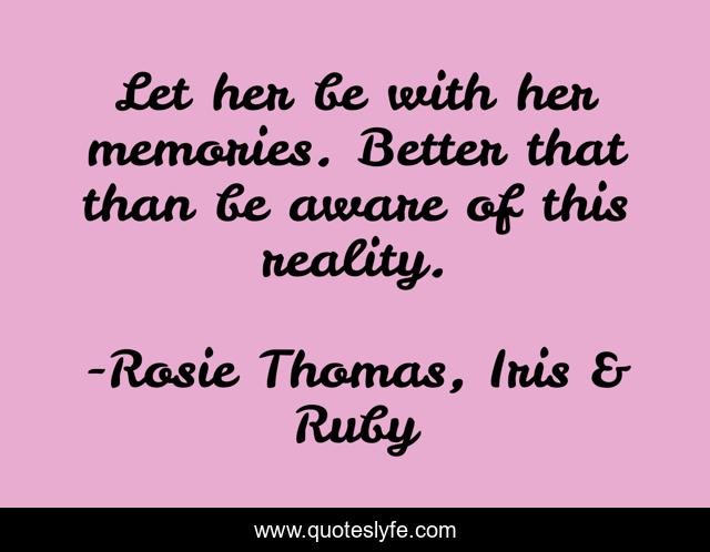 This page presents the quote "Let her be with her memories. Better that than be aware of this reality.". Author of this quote is Rosie Thomas, Iris & Ruby. .