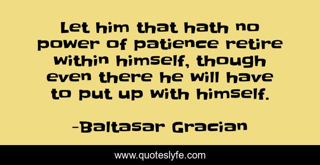 This page presents the quote "Let him that hath no power of patience retire within himself, though even there he will have to put up with himself.". Author of this quote is Baltasar Gracian. This quote is about retire, within, power,.