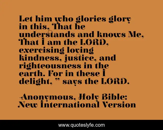 This page presents the quote "Let him who glories glory in this, That he understands and knows Me, That I am the LORD, exercising loving kindness, justice, and righteousness in the earth. For in these I delight, ” says the LORD.". Author of this quote is Anonymous, Holy Bible: New International Version. This quote is about glory, justice, god, loving-kindness, understand, righteous,.